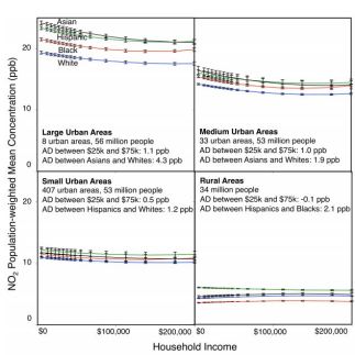 Income also plays a role in pollution exposure, but not as much as you might think. “Both race and income matter, but race matters more than income,” says Julian Marshall, a professor of environmental engineering at the University of Minnesota. “And that’s a really important point, because when you start talking about differences by race people say, ‘Oh, that’s just income.'”