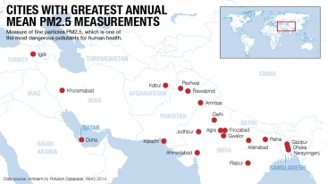 Half of the top 20 cities in the world with the highest levels of PM2.5 were in India, according to the pollution data released by the WHO, which included 1,600 cities. Other cities with high levels were located in Pakistan and Bangladesh.
