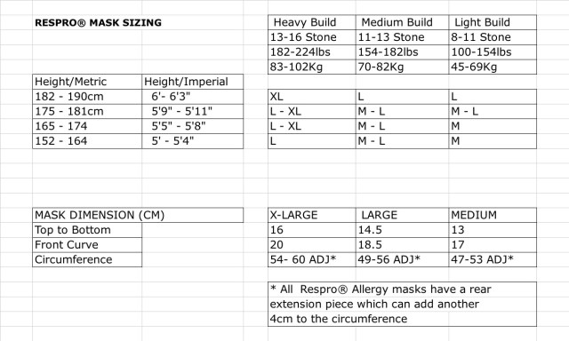 With the exception of the Bandit™, the Allergy™ mask (small available) and the FB-1 mask (XL available), there are two sizes available, medium and large. Generally, medium will be suitable for the average size women and large for the average size man. Please use the table below for guidance.