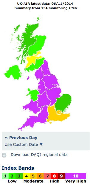 Readings from the government’s monitoring network show pollution at 10 out of 10 on the Daily Air Quality Index rankings, across the country. During the Sahara dust smog episode in April, pollution was at similar levels across the south-east and London.
