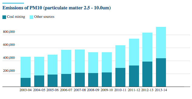 A study of the federal government’s annual national pollutant inventory, which was released this week, showed that 435,000 tonnes of a type of fine particle called PM10, named because it is just 10 micrometres in diameter, was emitted by coal companies in 2012-13.
