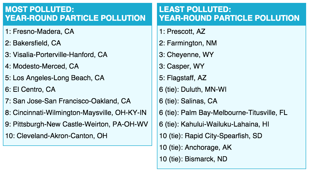 California had some of the most polluted cities, with Los Angeles-Long Beach, Bakersfield, Fresno-Madera and the Visalia-Porterville-Hanford area among the top five cities across all three categories.