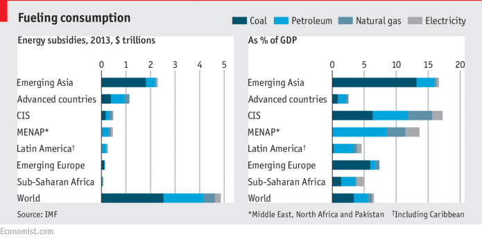 Defining subsidies is tricky. The simplest measure is the amount of taxpayers’ money used directly to keep a price artificially low. A broader one includes the costs borne by others, such as pollution, and exemptions from taxes. The IMF uses the wider definition to reach its $5.3 trillion figure. Seen more narrowly, the cost would be $333 billion. But this is only lower than last year because of falling oil prices.