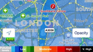 The app – ‘City Air’ – alerts users to periods of high pollution, and shows levels of all currently measured types of pollution – nitrogen dioxide, small particiles, PM10 and PM2.5 and ozone – across the capital.