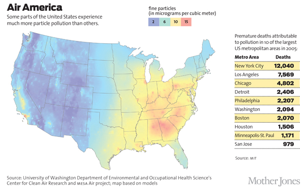 The quickest way to rid our cities of particle pollution would be by cleaning up diesel engines. That may be in the works; the Obama administration recentlyproposed much tougher emissions standards for trucks. Since 2007, the EPA has required new diesel buses and trucks to utilize cleaner-burning engines, but because diesel engines last 20 or 30 years, millions of the older ones are still on the roads. Beginning around 2000, California started requiring owners of old diesel vehicles—from Greyhounds to big rigs and school buses—to begin replacing their engines. But a significant number of old, dirty engines are still on the road—and in many parts of the United States, engine upgrades are not yet mandatory.