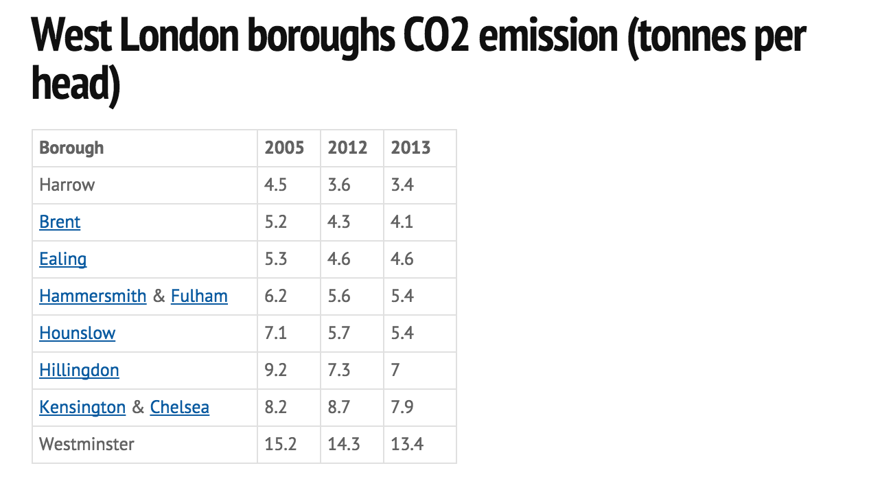 Elsewhere in west London, Westminster emitted the most CO2 with 13.4 tonnes per head in 2013.