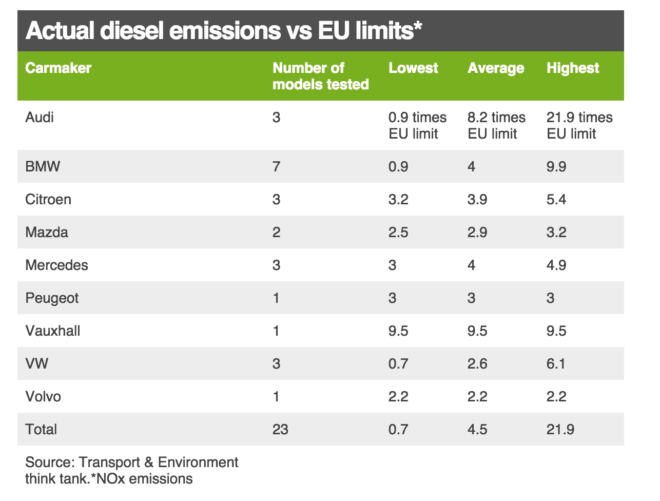 A separate test showed that some individual cars emit even more – an Audi A8 emitted 22 times the limit. Only three cars – an Audi A5, a VW Golf and a BMW 3-series – complied with EU regulations.