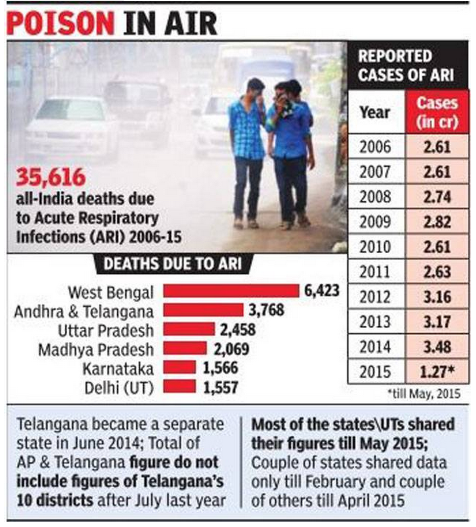 Union environment ministry, which generally avoids sharing details of air pollution-linked deaths, made an exception on Thursday when it said in Parliament that more than 35,000 people had died due to acute respiratory infections (ARI) across India in close to 10 years. More than 2.6 crore cases were reported every year during the period.