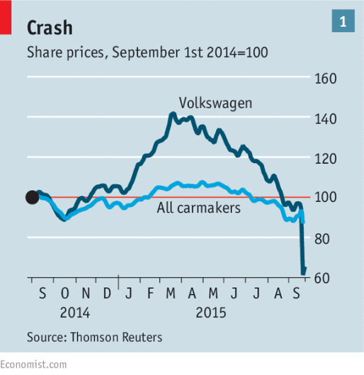 The damage to VW, the world’s biggest carmaker, is cataclysmic. The company’s shares have collapsed by a third since its chicanery surfaced (see chart 1). It faces billions of dollars in fines and other financial penalties. Lawsuits will be flying their way to its headquarters in Wolfsburg. Its strategy for the crucial American market is ruined; its reputation is in tatters. Its boss, Martin Winterkorn—who in 2009, when the misleading “defeat” software made its first appearance, was also directly responsible for the company’s R&D—resigned on September 23rd.