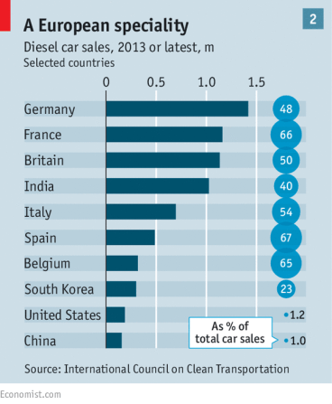 As well as being a threat to Germany’s export earnings, the scandal also menaces the brainchild of one of its most eminent engineers, Rudolf Diesel—at least as far as its future in cars is concerned. Diesel engines use fuel more efficiently than engines with spark plugs, and better efficiency reduces both drivers’ expenses and carbon-dioxide emissions. Those advantages have endeared diesel engines to thrifty Europeans with green governments; none too popular elsewhere in the world, they power half of Europe’s cars (see chart 2).