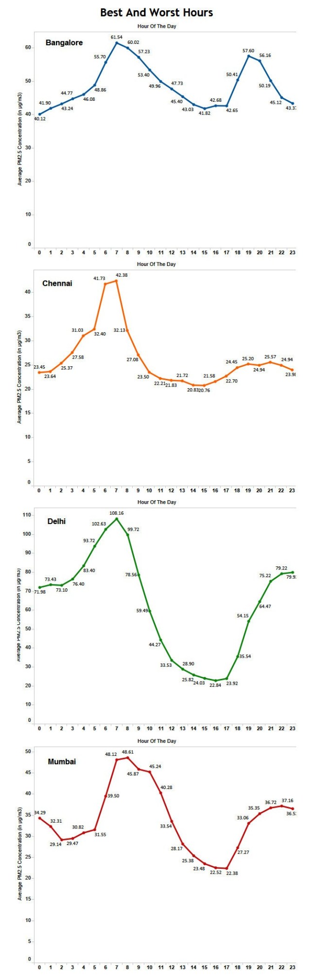 The worst hour for a Mumbaikar is 8 am, with PM 2.5 levels reaching 48.61 μg/m3; the air started to worsen after 5 am. The best air quality was registered at 5 pm, when PM 2.5 levels were 22.38 μg/m3.