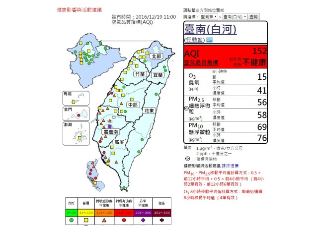 Environmental Protection Administration (EPA) on Monday warned the residents in central and southern Taiwan of poor air quality as the Air Quality Index (AQI) readings at some of the region’s monitoring stations have reached “code red” levels.