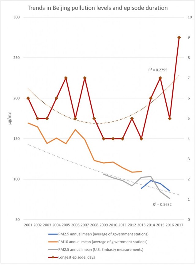 While pollution levels remain dangerously high, Beijing has seen impressive and continuous improvements in average pollution levels over the past 16 years, as the government has implemented strong emissions standards, improved enforcement and set absolute targets for limiting coal consumption to clean up the problem.
