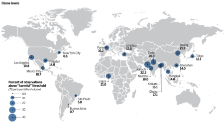The team has found that Karachi, Pakistan, holds the world’s title for ozone. Of the nearly 300 measurements collected over 1 year, roughly a third exceeded what the researchers considered a “harmful” threshold for ozone, which can lead to smog. Ozone is high in other cities as well. But when it comes to ammonia, a gas that helps form airborne particles that can trigger lung disease, some cities stand out: Kolkata, India, exceeds the “harmful” threshold 47.1% of the time, Dhaka, Bangladesh, exceeds it 51.6% of the time, and Delhi exceeds it 73.5% of the time. Ammonia, which comes from livestock excrement and fertilizer, is more common in cities surrounded by lots of agricultural activity.