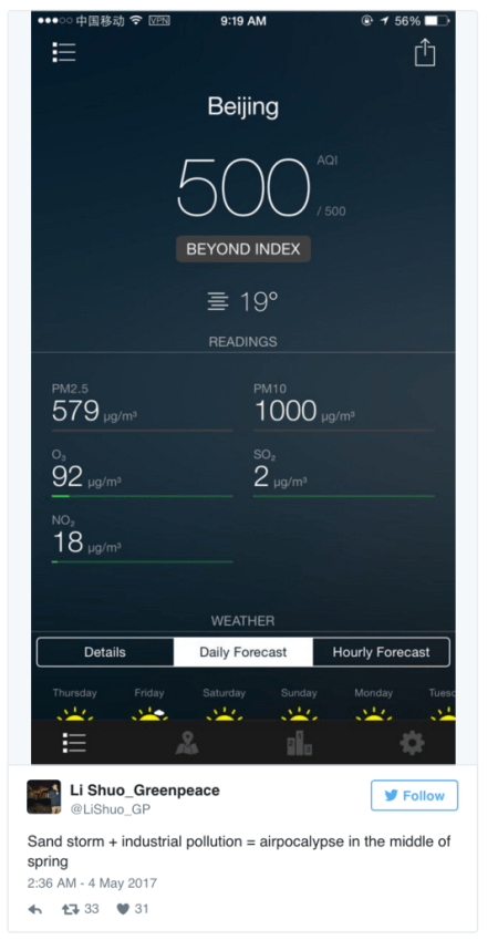 “Sand storm + industrial pollution = airpocalypse in the middle of spring,” Li added.