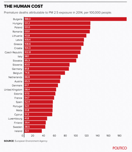 Bulgaria and Poland have the highest levels of premature deaths attributed to particulate pollution.