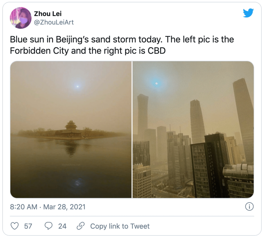 via Sandstorms turn sun blue and sky yellow in Beijing | Air pollution | The Guardian