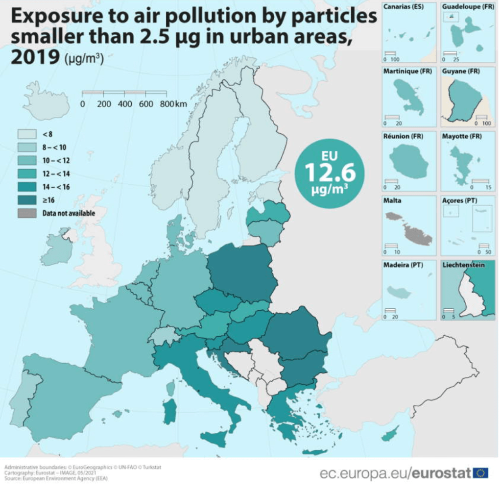 Among the EU member states, the annual mean concentration of fine particles (PM2.5) is highest in urban areas of Bulgaria (19.6 μg/m3) and Poland (19.3 μg/m3), followed by Romania (16.4 μg/m3) and Croatia (16 μg/m3).