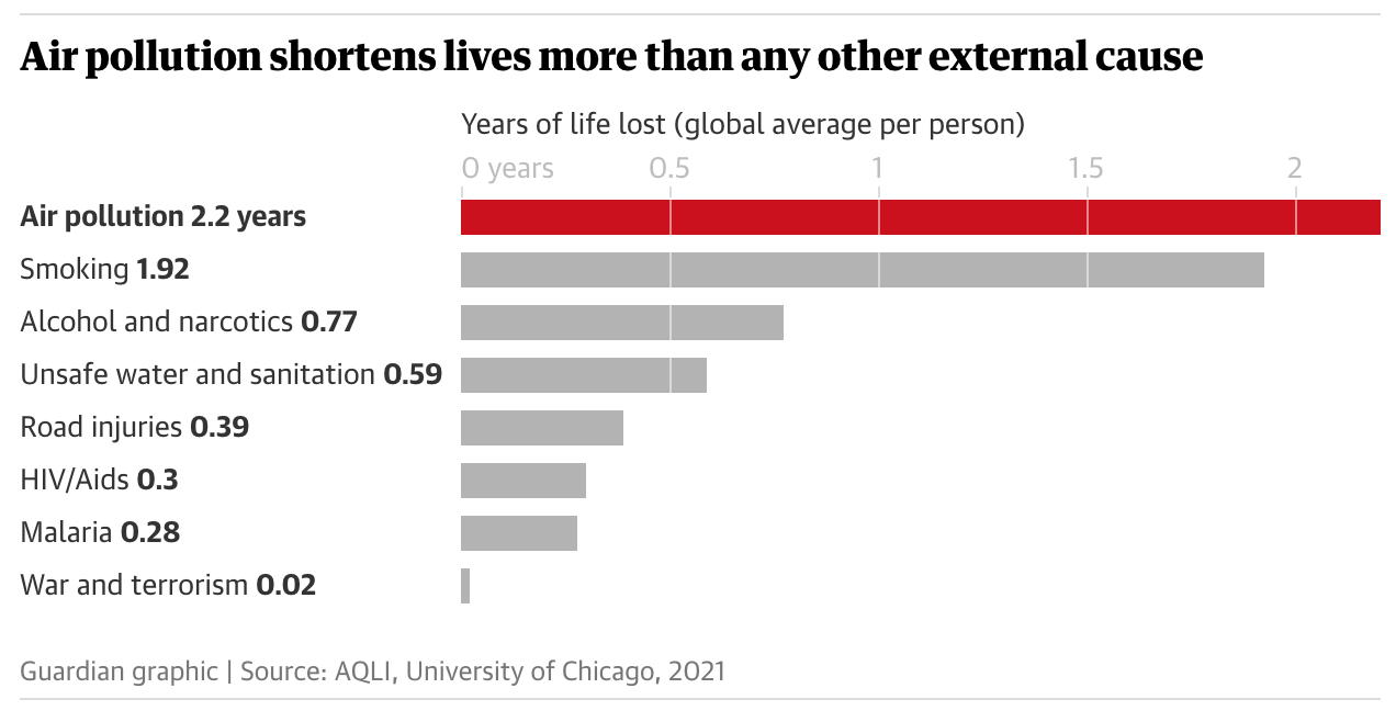 “Air pollution is the greatest external threat to human health on the planet, and that is not widely recognised, or not recognised with the force and vigour that one might expect,” said Prof Michael Greenstone at the University of Chicago. Greenstone and colleagues developed the Air Quality Life Index (AQLI), which converts air pollution levels into their impact on life expectancy.