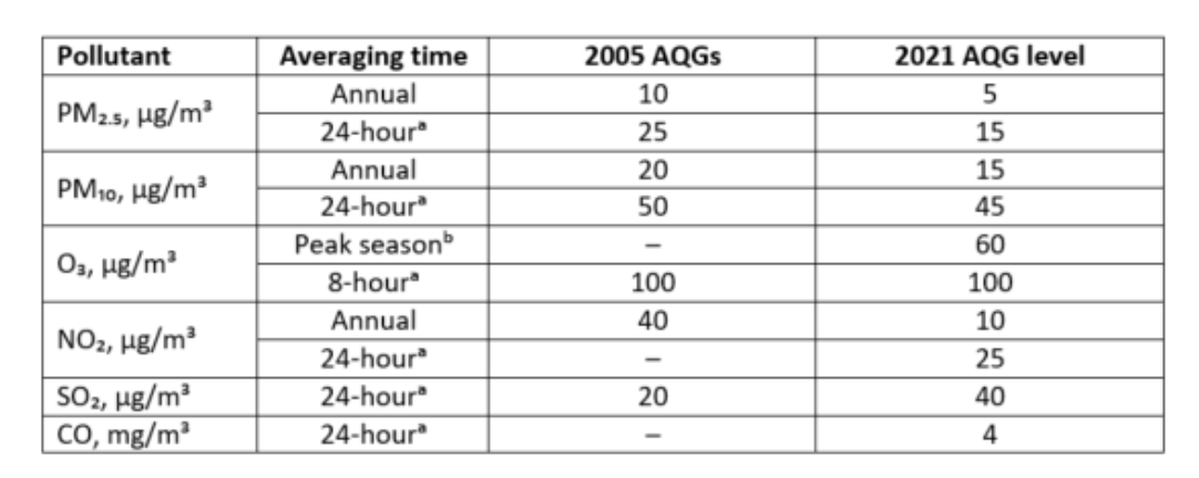 The guidelines set out new healthy guideline levels for six pollutants, which include particulate matter (PM2.5 and PM10), ozone (O₃), nitrogen dioxide (NO₂) sulfur dioxide (SO₂) and carbon monoxide (CO).