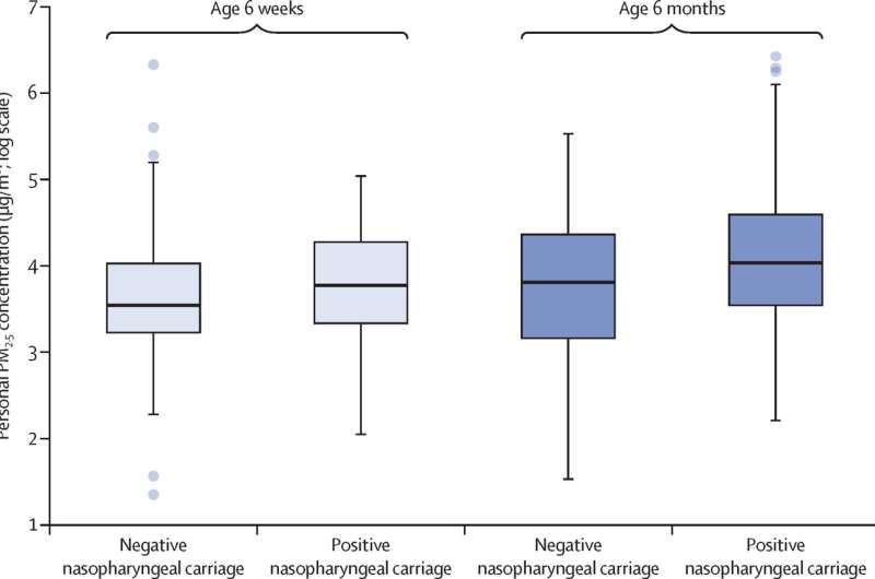 Through exposure-response analysis, a statistically significant 10% increase in risk of Streptococcus pneumonia carriage in children was observed for a unit increase (deciles) of exposure to PM2.5 (ranging from 3.9 μg/m³ to 617.0 μg/m³).