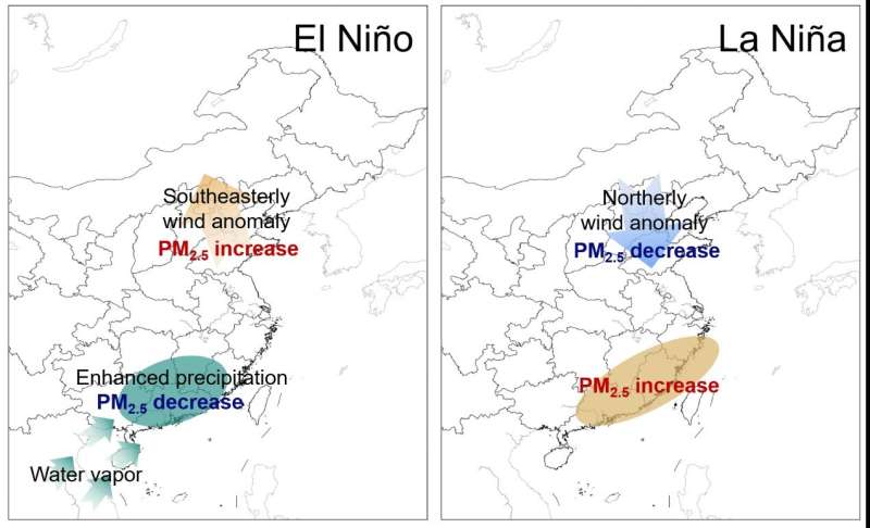 Their paper reveals that the wintertime PM2.5 concentrations in the Beijing–Tianjin–Hebei and Fenwei Plain regions during El Niño years are higher than those during La Niña years, which can be explained by the anomalous winds during ENSO events. In the Pearl River Delta region, PM2.5 concentrations decrease in El Niño relative to La Niña years owing to the enhanced precipitation in El Niño events. In the Yangtze River Delta region, the comprehensive effects of wind and precipitation anomalies lead to the unpredictability of the impacts of ENSO on PM2.5.