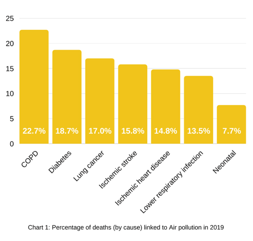 Long-term exposures to air pollution contribute to an increased risk of illness and premature death from chronic noncommunicable diseases, such as ischemic heart disease, lung cancer, chronic obstructive pulmonary disease (COPD), stroke, and type 2 diabetes as well as lower respiratory infections (e.g., pneumonia), especially in children under 5 years of age.