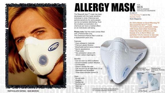 The Respro® Allergy™ Mask has been developed with the hyper sensitive individual in mind. Chemical and particle sensitivity for some people can be completely debilitating. Even the smaller concentration of a chemical can have a marked effect on an individuals well being.