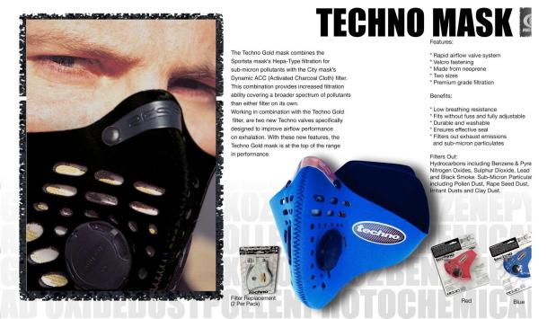 The Respro® Techno™ mask combines the Sportsta mask’s Hepa-Type filtration for sub-micron pollutants with the City mask’s Dynamic ACC (Activated Charcoal Cloth) filter. This combination provides increased filtration ability covering a broader spectrum of pollutants than either filter on its own.